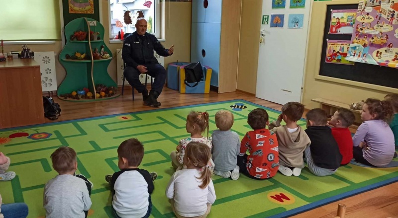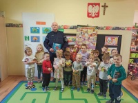 Przedszkolaki z grupy "Krasnale" odwiedził pan Policjant - nasz dzielnicowy. Dzieci miały okazję poznać pracę policjanta, przypomniały sobie wspólnie zasady bezpiecznego poruszania się na drodze, numery alarmowe oraz przyswoiły sobie ogólną wiedzę o zagrożeniach, na które mogą być narażone dzieci. Na koniec chętne przedszkolaki mogły przymierzyć i obejrzeć z bliska atrybuty policjanta. Za spotkanie serdecznie dziękujemy!