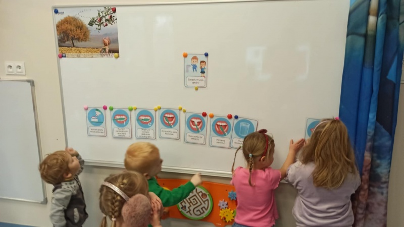 Grupa Zuchy oficjalnie rozpoczęła codzienne mycie zębów! Dzieci poznały techniki szczotkowania oraz zrozumiały znaczenie higieny jamy ustnej dla zdrowia.